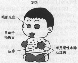 川崎病的主要表现:①发热40℃。持续7~14天或更长,呈稽留或弛张热型,抗生素治疗无效。②球结合膜充血,于起病3~4天出现,无脓性分泌物,热退后消散。③唇及口腔表现:唇充血皲裂,口腔黏膜弥漫充血,舌乳头突起、充血呈草莓舌。④手足症状:急性期手足指(趾)端硬性水肿和掌跖红斑,恢复期指(趾)端甲下和皮肤交界处出现膜状脱皮,指(趾)甲有横沟,重者指(趾)甲亦可脱落。⑤皮肤表现:多形性红斑和猩红热样皮疹,常在第1周出现。肛周皮肤发红、脱皮。⑥颈淋巴结肿大:单侧或双侧,坚硬有触痛,但表面不红,无化脓。病初出现,热退时消散。